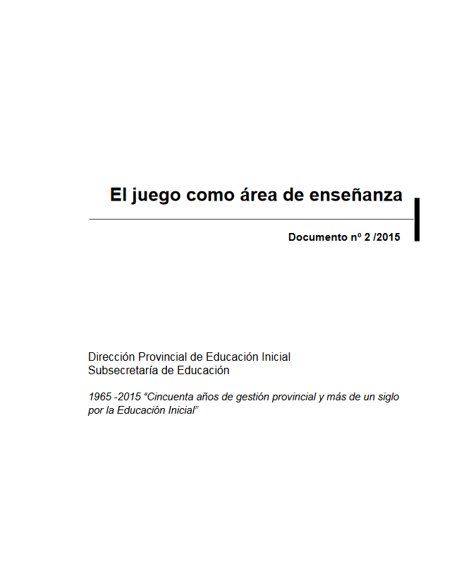 Documento de trabajo elaborado con el propósito de brindar orientaciones a los equipos directivos y docentes de las instituciones del Nivel Inicial, tendientes a fortalecer la enseñanza en el área curricular de juego.