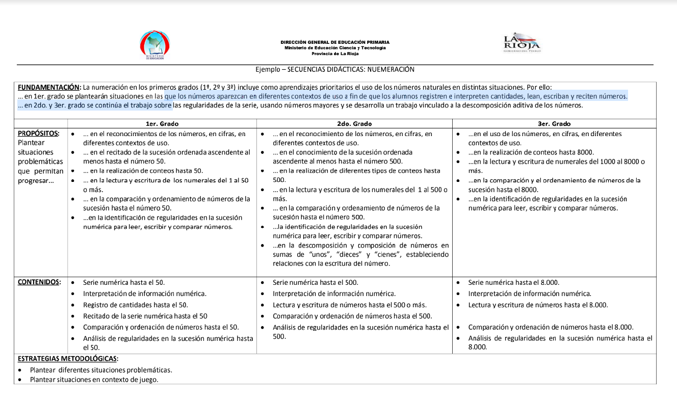 Cuadro ejemplo de secuencias didácticas sobre Numeración para el primer, segundo y tercer ciclo del Nivel Primario.