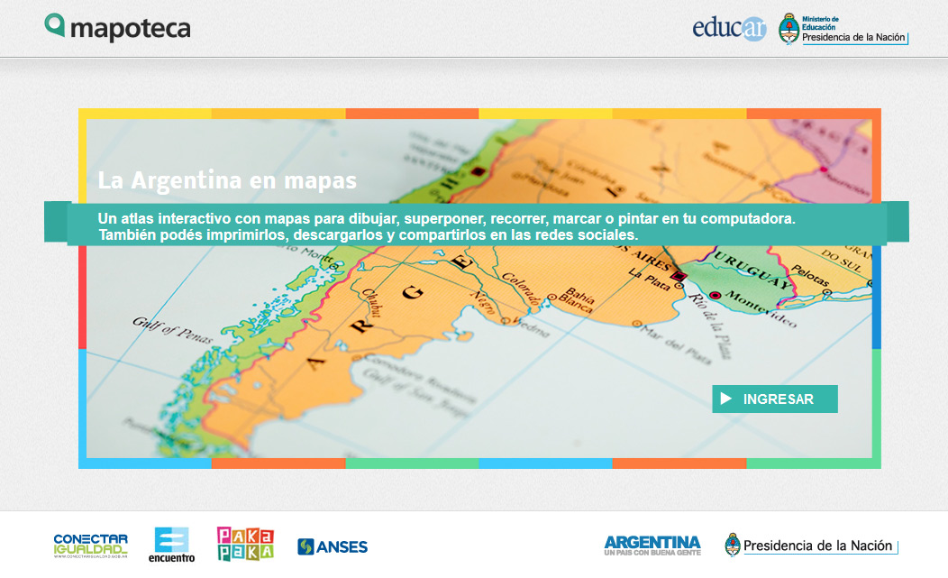 Un atlas interactivo con mapas para dibujar, superponer, recorrer, marcar o pintar en tu computadora. Imprimirlos, descargarlos y compartirlos en las redes sociales. Además ofrece secuencias didácticas para realizar actividades de diferentes zonas del país.