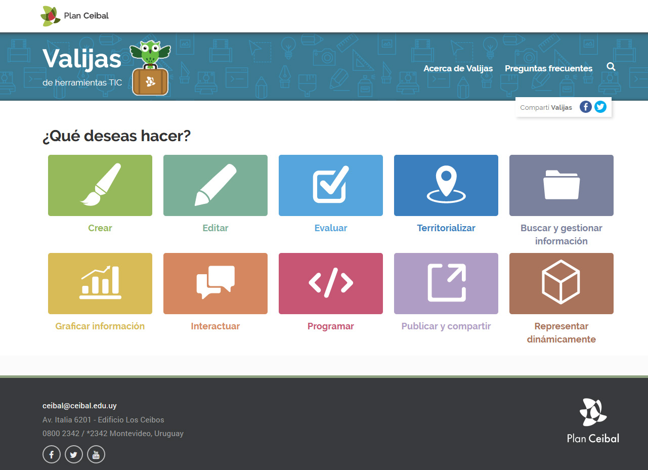 Valijas de herramientas TIC es un portal elaborado por Plan Ceibal del Ministerio de Educación y Cultura de Uruguay ofrece de recursos seleccionados que incluye herramientas gratuitas, en línea y/o descargables destinadas al uso, principalmente, por parte de jóvenes estudiantes de Educación Media.